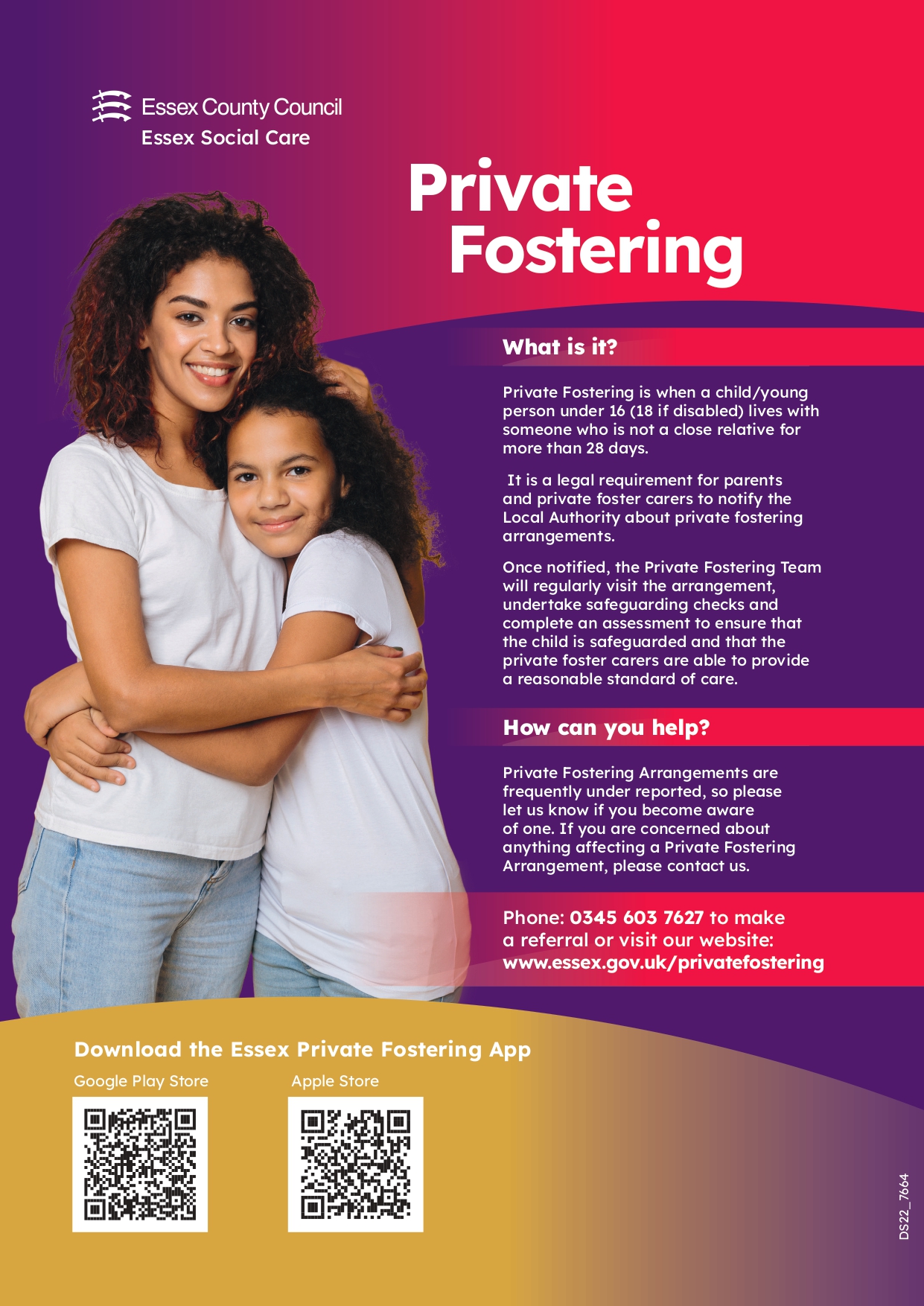 To find out more about Private Fostering and the legal requirements please read this leaflet here. You can call 0345 603 7627 to make a referral or visit the Essex County Council website.